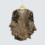 Oživte svůj styl touto béžovou blůzou zdobenou jemnými bílými květinovými vzory. Volánkové rukávy dodávají ženskost a pohyb, a její volný střih zajišťuje pohodlí ve vašem každodenním i slavnostním outfitu.