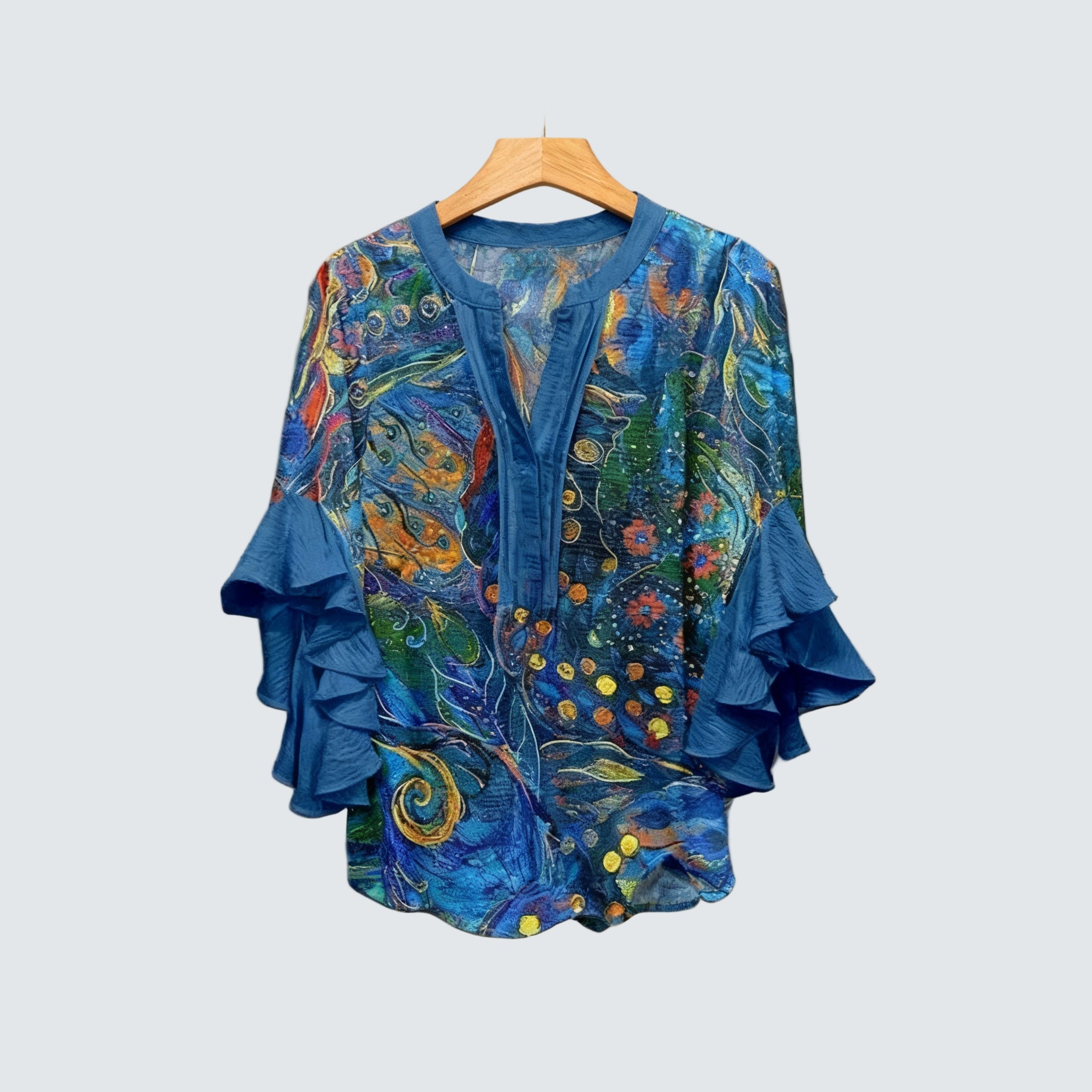 Vylepšete svůj umělecký styl tímto jasně modrým topem, který je zdoben barevnými abstraktními vzory a detaily připomínajícími malířské plátno. Volánkové rukávy dodávají eleganci a pohyb, zatímco pohodlný střih z něj činí ideální kousek jak na každodenní nošení, tak na slavnostní příležitosti.