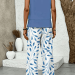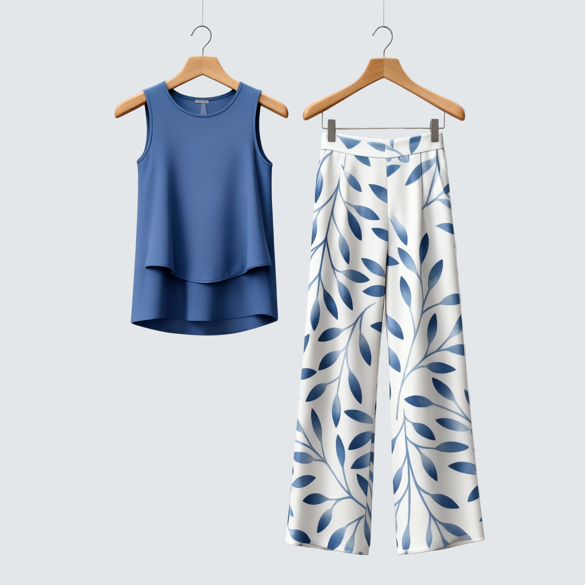Tidet™ set zachycuje esenci letní elegance a přirozeného klidu. Hluboký indigo top kontrastuje s bílými kalhotami zdobenými jemným listovým vzorem, čímž vytváří harmonický a svěží vzhled. Ideální pro chvíle u moře, odpolední pikniky nebo dny, kdy chcete působit elegantně, ale bez námahy.