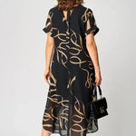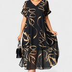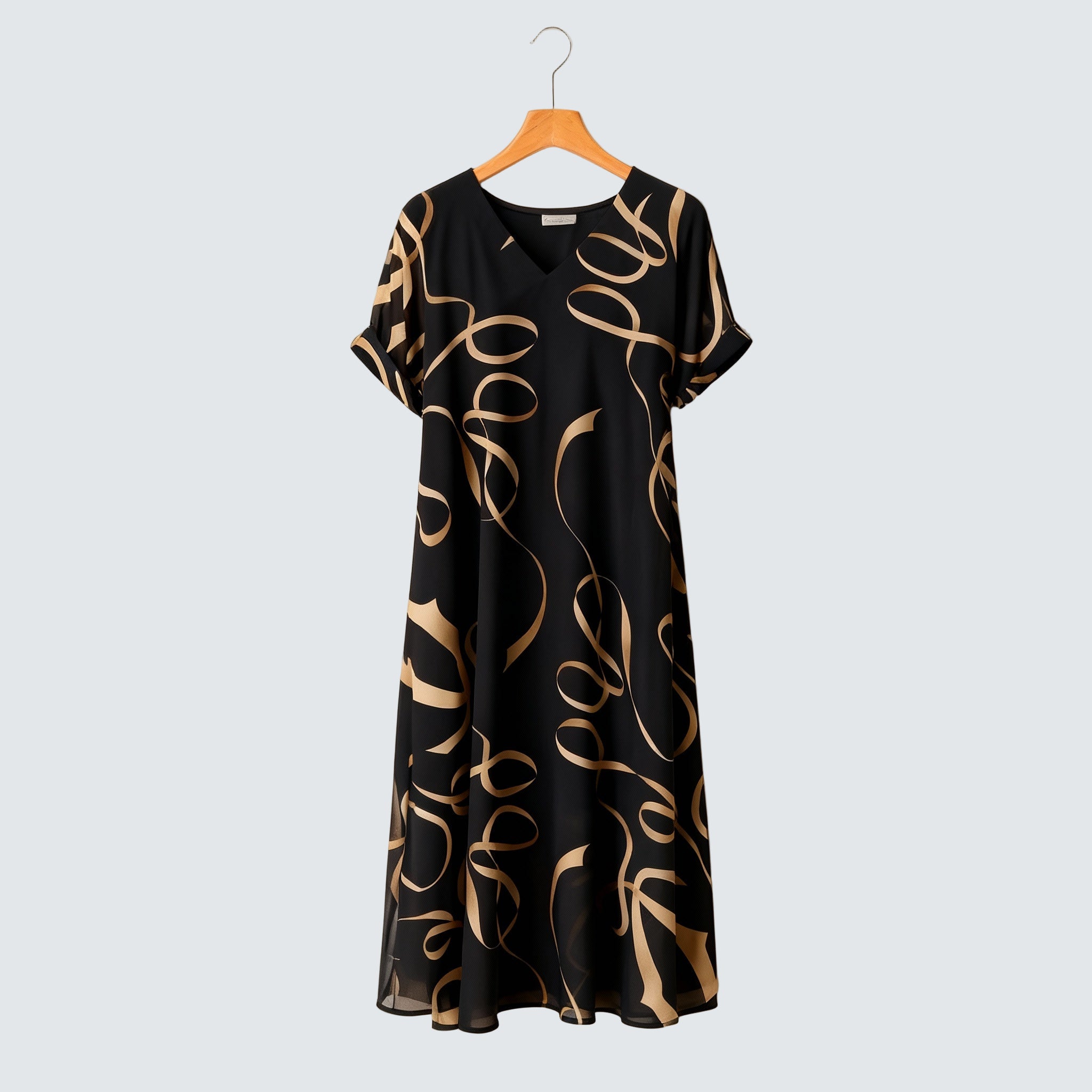 Šaty Valeria přinášejí dokonalou rovnováhu mezi elegancí a komfortem. Černá tkanina doplněná jemnými zlatými detaily vytváří luxusní, ale nenucený vzhled – ideální pro ženy, které chtějí vypadat sofistikovaně bez ztráty pohodlí. Perfektní volba pro večerní večeře, společenské akce i stylové dny ve městě.