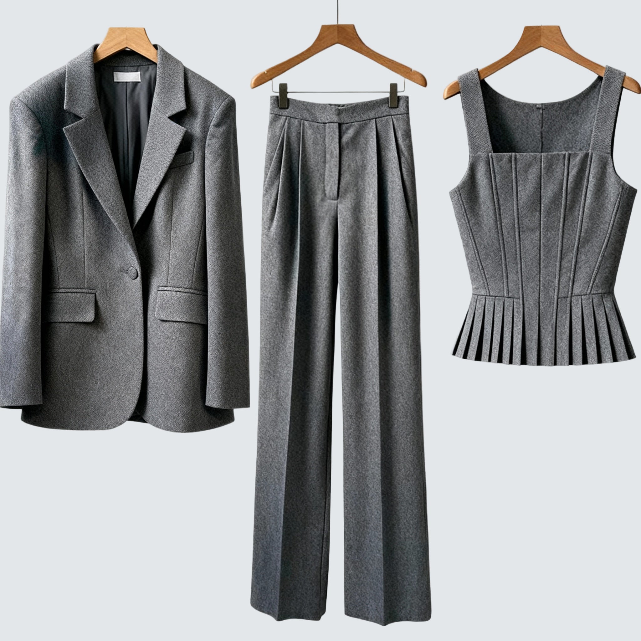 Sienna™ Power Trio set zosobňuje moderní ženskou sebejistotu. Kombinace přizpůsobeného blejzru, tvarovaného korzetu a kalhot s vysokým pasem vytváří siluetu, která zaujme na první pohled. Ideální pro okamžiky, kdy chcete působit rozhodně, stylově a nezapomenutelně.