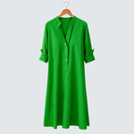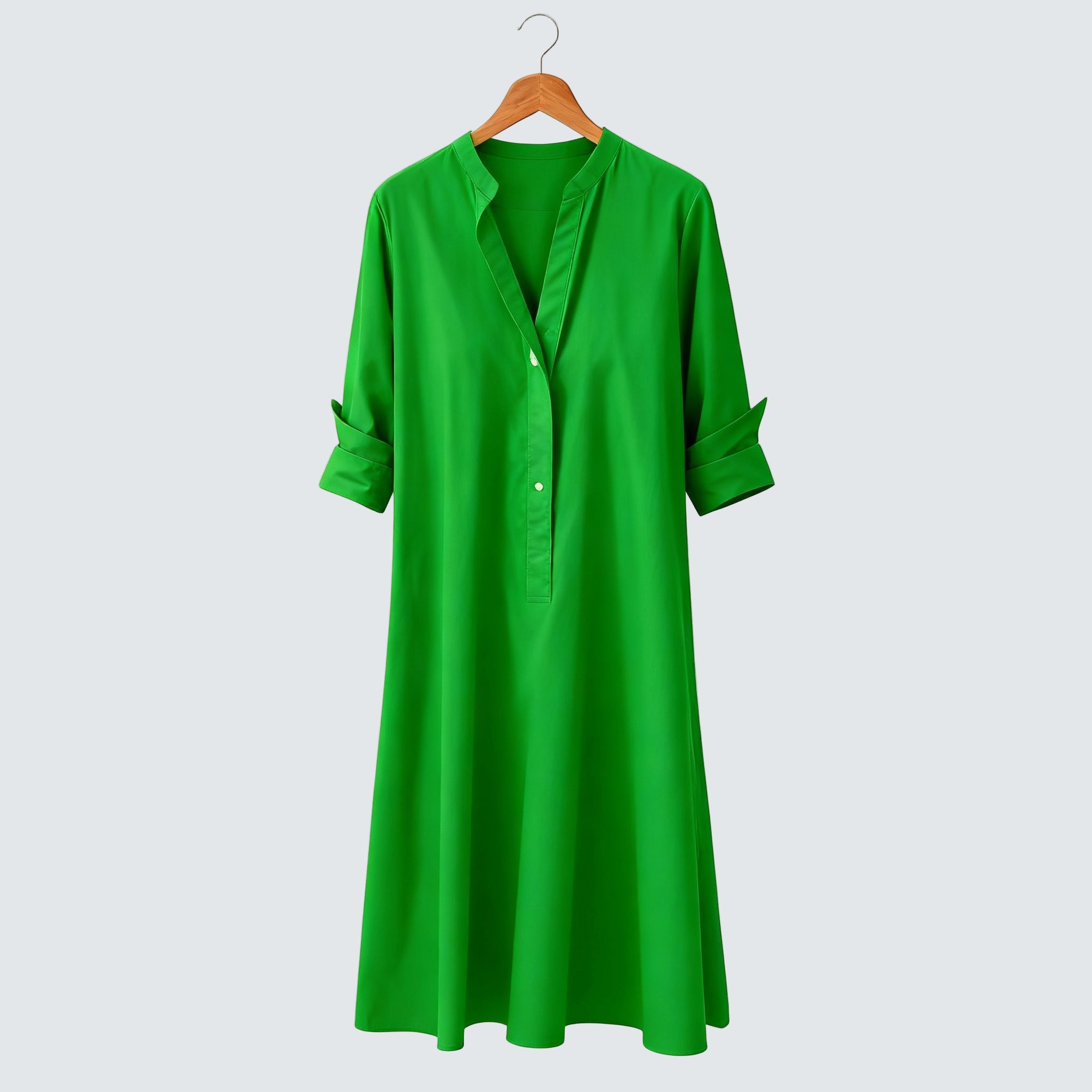Šaty Bernadette jsou oslavou klasické elegance a decentní sebevědomí. Jejich jasné linie, hluboký smaragdově zelený odstín a rafinovaný střih vytvářejí vzhled, který nikdy nevyjde z módy. Ať už jdete na večeři, hostíte zahradní párty, nebo se jen chcete obléknout krásně, v šatech Bernadette se styl a bezstarostnost spojují. Strukturovaný límec, zapínání na knoflíky a mírně rozšířená A-linie lichotí postavě bez zbytečných ozdob. Jasná, čistá barva mluví sama za sebe — vytváří vzhled, který je současně decentní a působivý. Jednoduché, rafinované, nezapomenutelné.