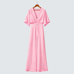 Elegantní silueta – hluboký V-výstřih a pás zvýrazňují postavu s jemností.