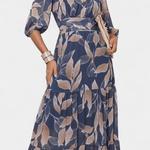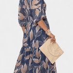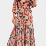 Aïsha-mekko spojuje sofistikovaný listový vzor s lehkým, elegantním střihem, který přirozeně lichotí postavě. Hluboký V-výstřih, volné rukávy a zvýrazněný pas dělají z této šaty dokonalou volbu pro chvíle, kdy se chcete cítit výjimečně – bez námahy. Ideální jak pro formální příležitosti, tak pro slunečné dny s stylem.