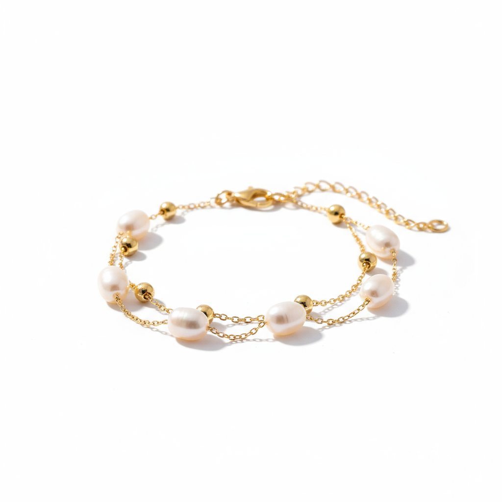 Náramek Rimah zachycuje jemný rytmus soumraku pouště. Poslední sluneční paprsky tančí na dunách a sypou perly na písek. Každá hladká, kulatá perla odráží klid oázy, zatímco zlaté řetízky ve filigránovém stylu jsou formovány větrem.